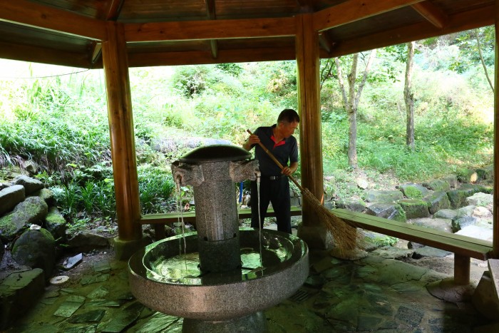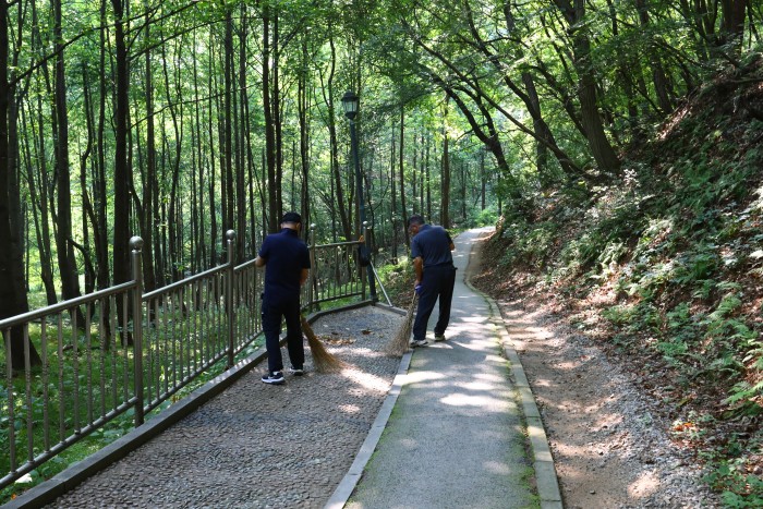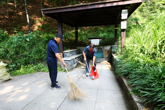 이처럼 많은 이들이 찾아오는 약수터의 주위 환경을 쾌적하게 가꾸고 있는 두 어르신이 있다. 바로 계룡시니어클럽에서 운영하는 노인역량활용사업의 하나인 ‘지역시설업무지원’에 참여하고 있는 두 분이다. 이들은 매주 월요일부터 금요일까지 오전마다 약수터 주변을 깨끗하게 청소하며 환경정화 활동을 꾸준히 이어가고 있다.