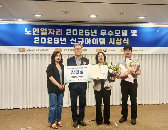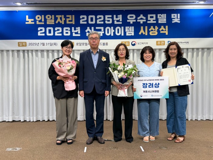 계룡시니어클럽(관장 유인화)이 7월 31일 보건복지부가 주관한 ‘2026년도 신규 노인 일자리 개발 아이템 공모전’ 시상식에서 장려상(한국노인인력개발원장상)을 수상하는 쾌거를 이뤘다.