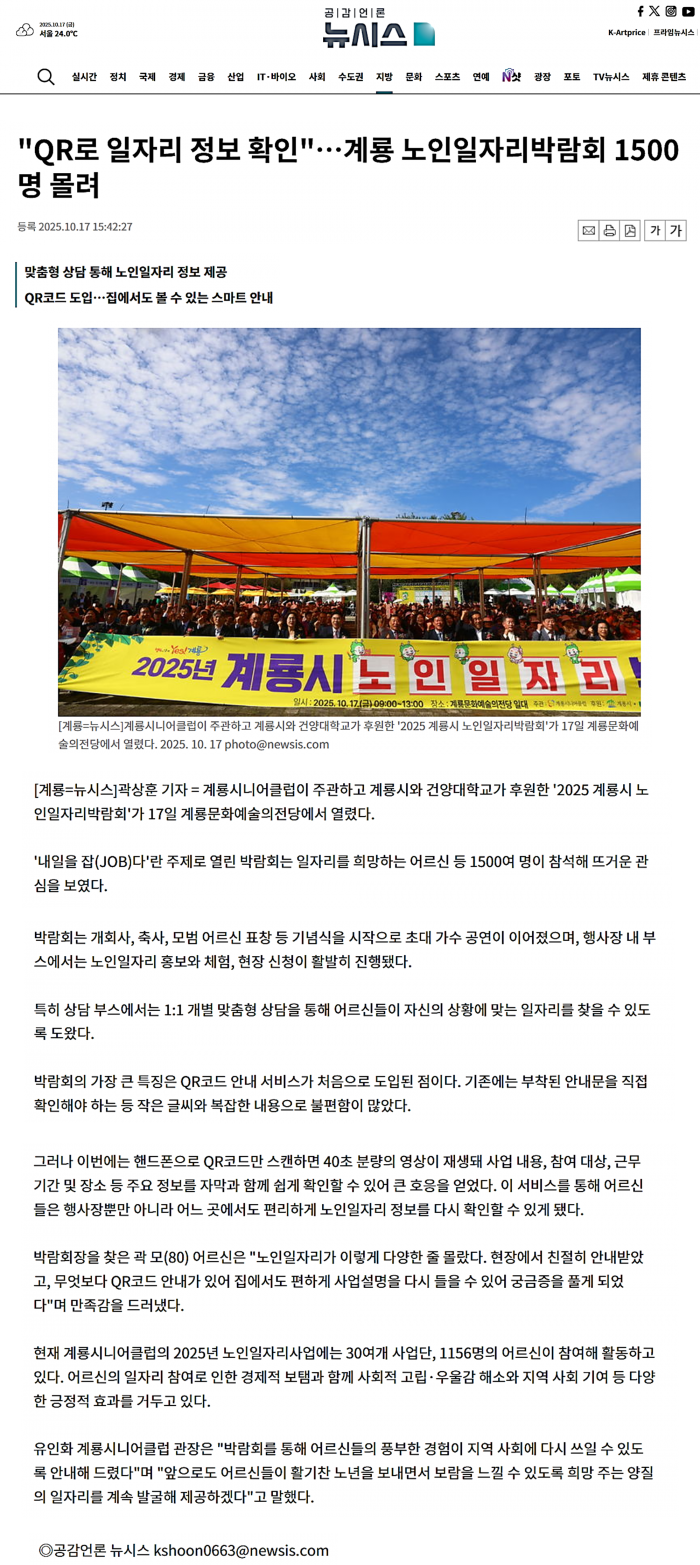 "QR로 일자리 정보 확인" · · · 계룡 노인일자리박람회 1500명 몰려 [뉴시스(2025년 10월 17일)]