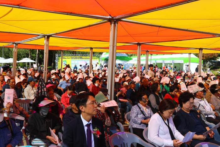 △ '2025 계룡시 노인일자리박람회' 기념식장에서 기관장, 지역시민, 어르신들이 유인화 관장의 개회사를 경청하고 있다.