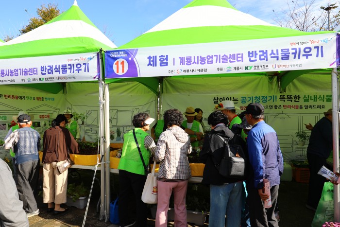 △ '2025 계룡시 노인일자리박람회'장을 찾아온 어르신들이 '반려식물키우기'부스에서 체험하고 있다.