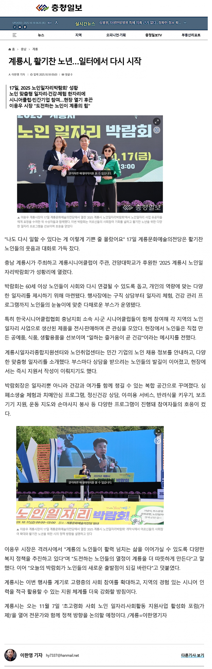 계룡시, 활기찬 노년 . . . 일터에서 다시 시작 [충청일보(2025년 10월 18일)]
