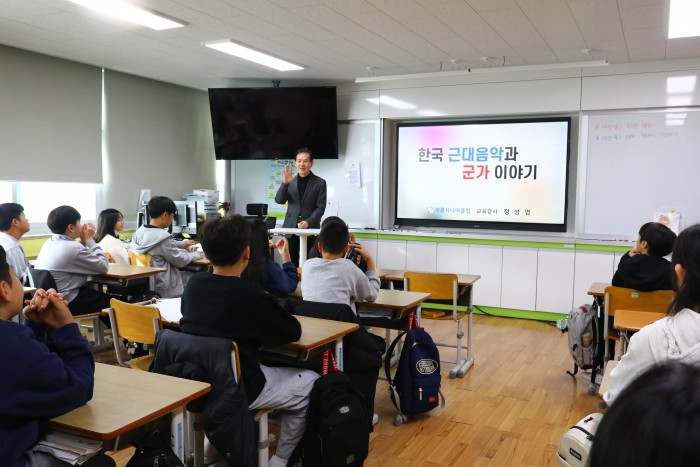 이날 음악 시간에는 정성엽 강사가 ‘한국 근대음악과 군가 이야기’를 주제로 강의했다. 정 강사는 동요 ‘팽이치기’ 영상을 들려주며 수업을 시작해 학생들의 호기심을 끌었다. 그는 “1882년 한미수호통상조약 때 연주된 ‘양키 두들’이 한국에 처음 소개된 서양음악”이라며 근대음악의 유입과 군가의 변천을 설명했다. “군가와 애국가는 나라를 지키려는 마음의 표현”이라며, 근대음악 유입 때 받아들인 오선지 음악 교육을 통해 한국 근대음악이 발전했다고 강조했다. 이어 광복군의 ‘압록강 행진곡’과 건전가요, 동요, 가곡 등으로 이어진 음악사의 흐름을 소개했다. 이어 건전가요가 우리나라 발전에 큰 영향을 끼쳤다면서 강의를 마쳤다