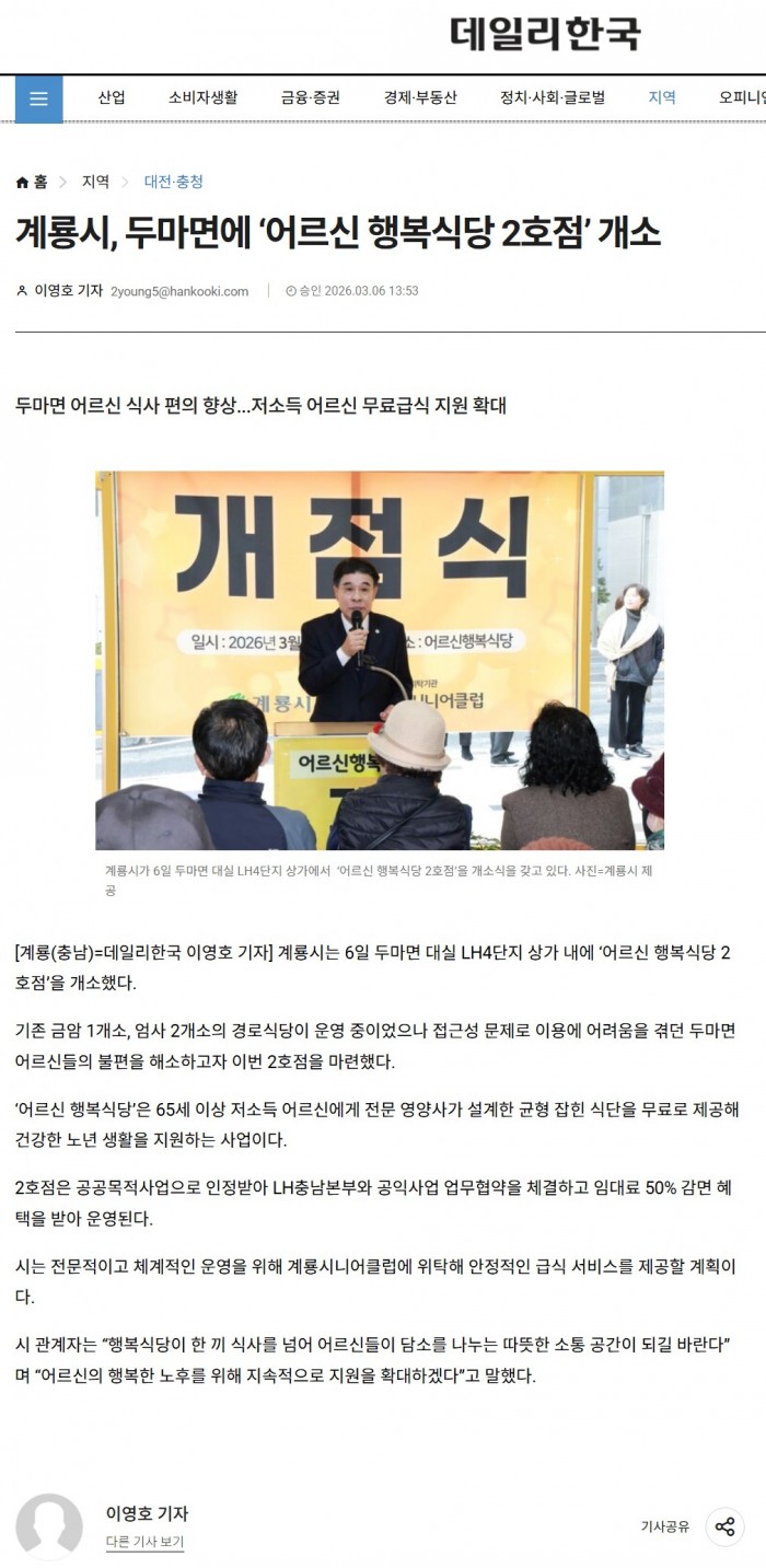 계룡시 어르신 행복식당 2호점 개소식 (데일리한국 / 2026. 03. 06)