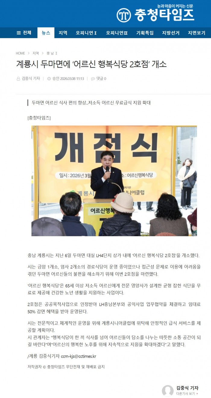계룡시 어르신 행복식당 2호점 개소식 (충청타임스 / 2026. 03. 06)
